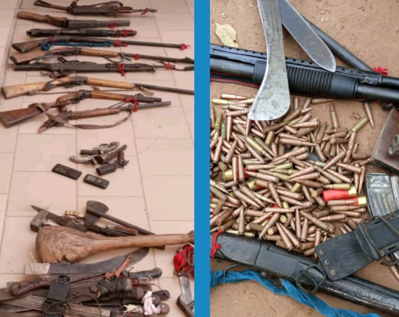 Items recovered included AK-47 rifles, one G3 rifle, one pump action rifle, one double barrel dane gun, five single barrel dane guns, two locally made pistols, and one locally made revolver pistol.